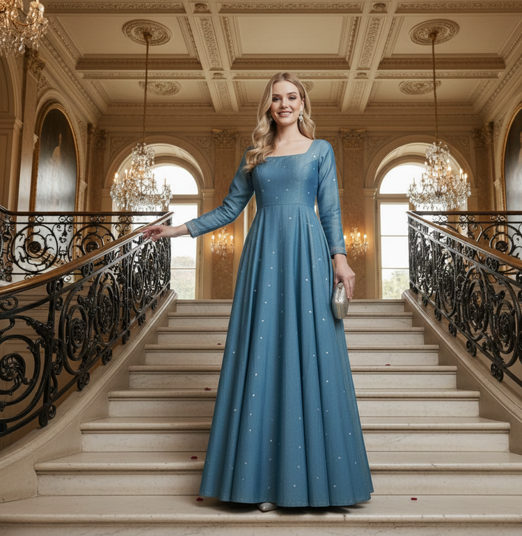 American Silk Embroidered Gown Pant Dupatta Set for Women