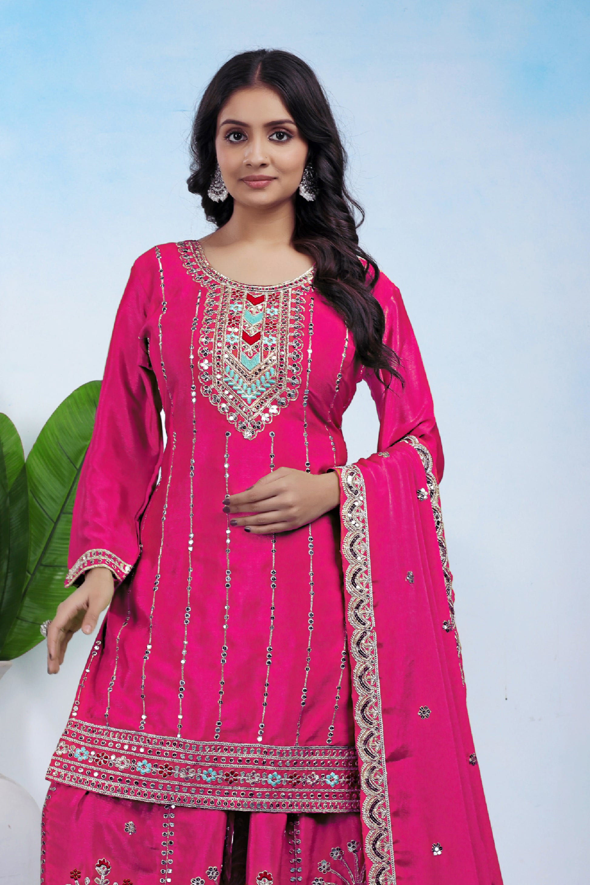 This elegant suit set is crafted from premium Chinon fabric and designed to offer a graceful blend of traditional charm and modern styling. The suit features intricate coding sequence embroidery work that adds a refined and festive appeal. A soft micro inner lining ensures comfort, while the fully stitched, ready-to-wear design provides a flattering fit. The sharara is designed with a generous 3.2-meter full flair, creating a beautiful flow and movement. Paired with a matching embroidered dupatta, this ensemble is perfect for festive celebrations, weddings, parties, and special occasions.