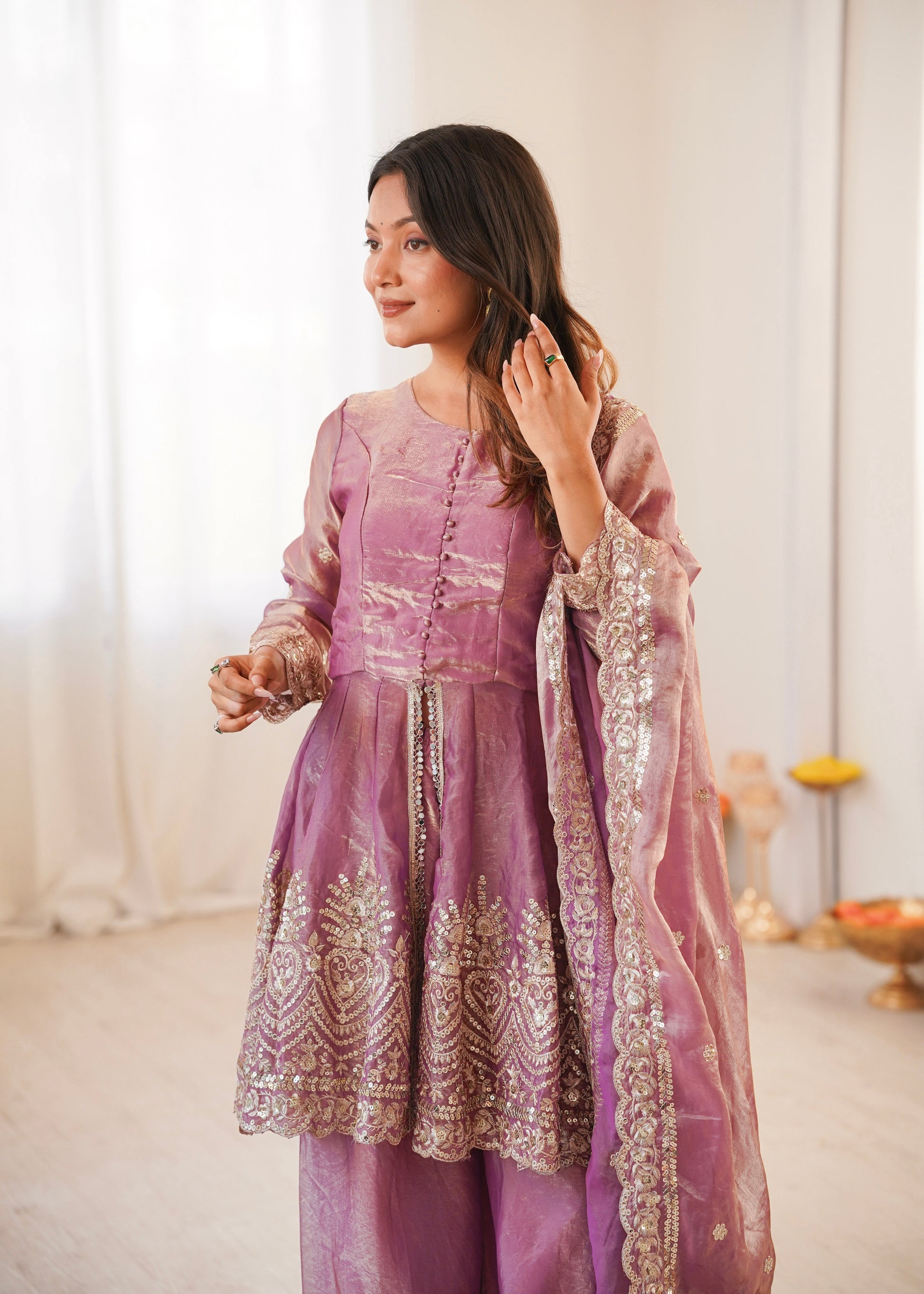Make a refined style statement with this elegant top, palazzo, and dupatta set crafted from premium heavy two tone Fandy silk. The top is beautifully adorned with heavy embroidery, sequins, and real mirror work, creating a rich and eye-catching design. Fully stitched and lined with soft micro cotton, it offers both comfort and a flattering fit.